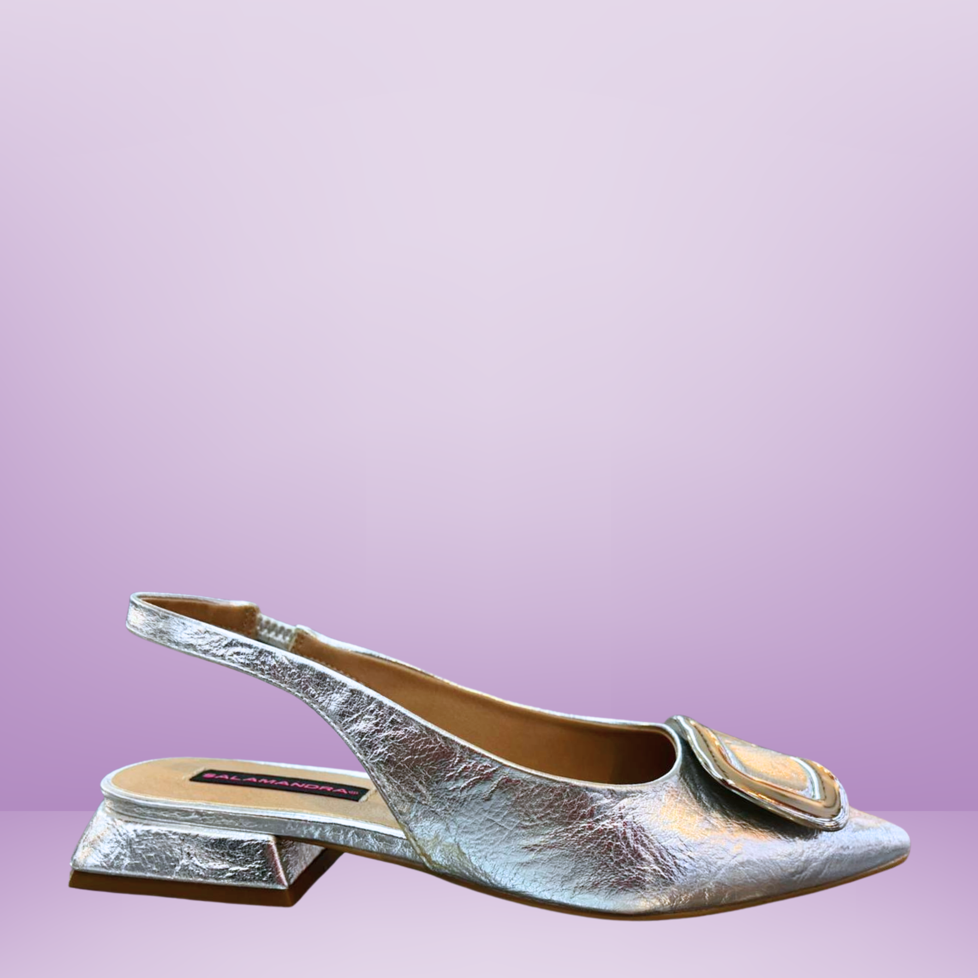 Su diseño metalizado y tacón bajo la convierten en la opción perfecta para lucir sofisticada sin sacrificar comodidad.