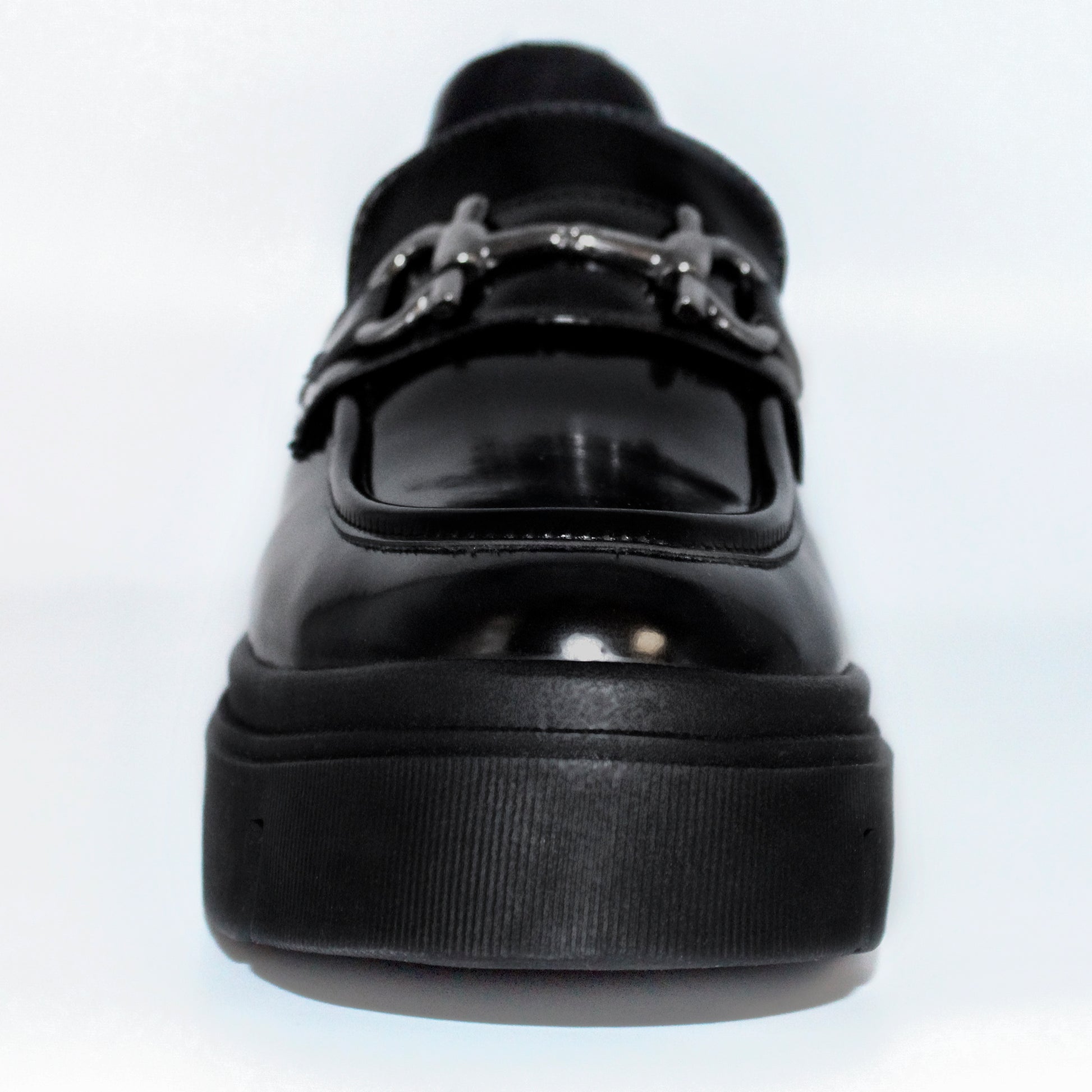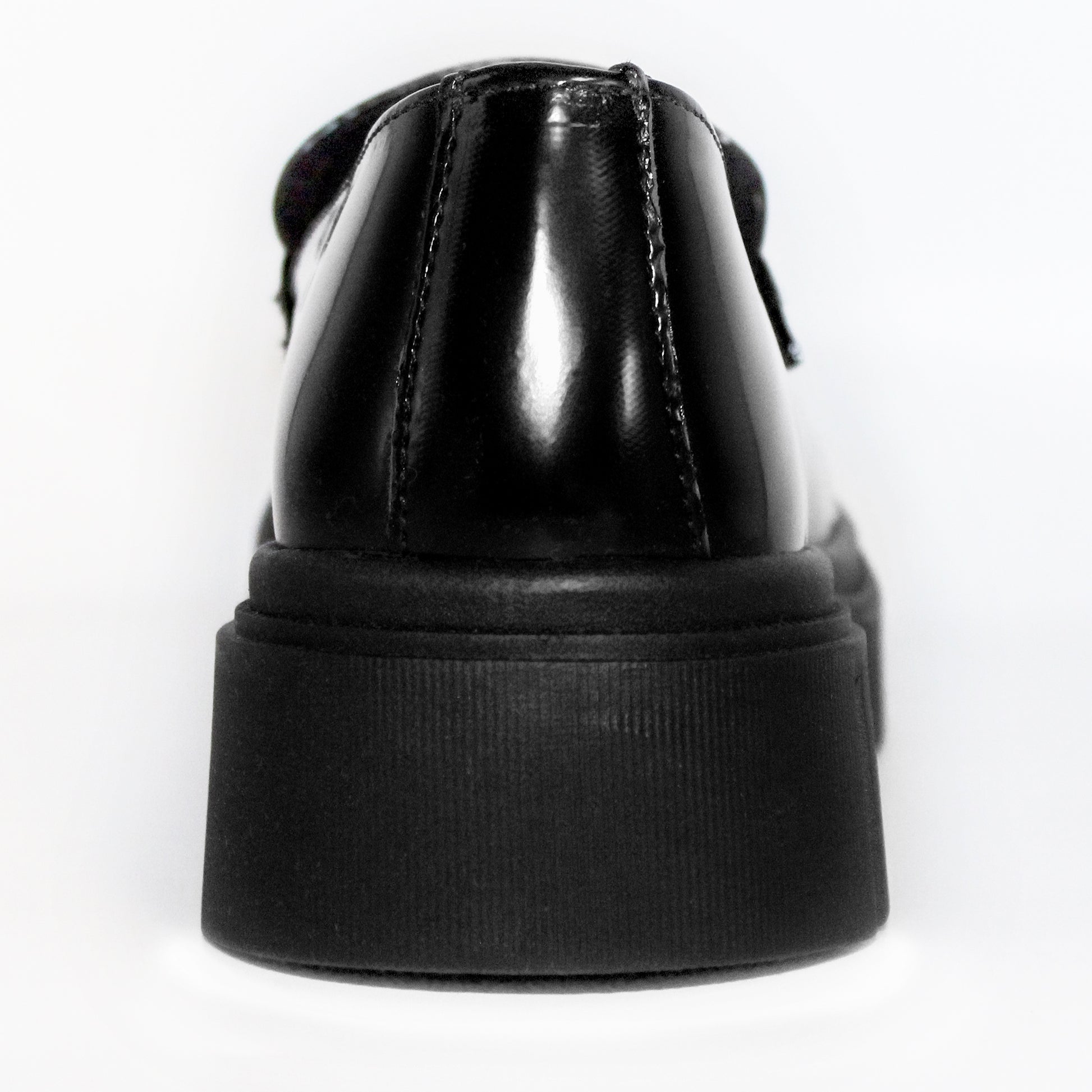 Eleva tu estilo con estos mocasines modernos que combinan elegancia y carácter urbano. Fabricados en charol negro de acabado brillante, destacan por su diseño atemporal con un toque contemporáneo gracias a la suela chunky de goma antideslizante.